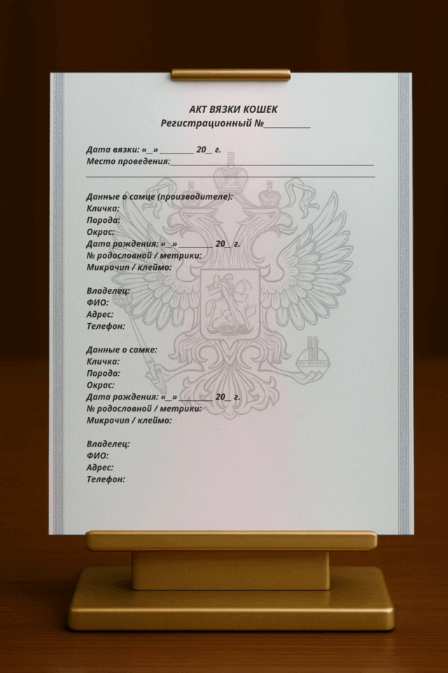 Акт вязки- это официальный племенной документ, подтверждающий факт случки кошки и кота. В акте фиксируются данные о владельцах животных, их породе, кличке, дате рождения, окрасе, номере родословной и клейма/микрочипа, а также точная дата вязки. Документ подписывается обеими сторонами и является основанием для дальнейшей регистрации помёта в А Information Center Cynology and Felinology.