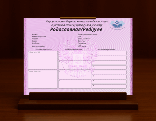Родословная собаки — это официальный документ, подтверждающий происхождение животного и его принадлежность к определённой породе. В ней содержатся данные о собаке, её владельце, а также сведения о предках до четырёх поколений, включая титулы, оценки и допуск к разведению. Родословная выдаётся на основании свидетельства о рождении щенка, прошедшего регистрацию в племенной книге клуба. Документ подтверждает чистоту породы, законность происхождения и является обязательным для участия в выставках, племенной деятельности и международных регистрациях. Каждая родословная имеет уникальный номер, QR-код, печать клуба и подпись ответственного лица. Родословные, оформленные по стандартам ICCF, признаются в России и за рубежом в системе ICCF, обеспечивая прозрачность происхождения и защиту прав владельца.