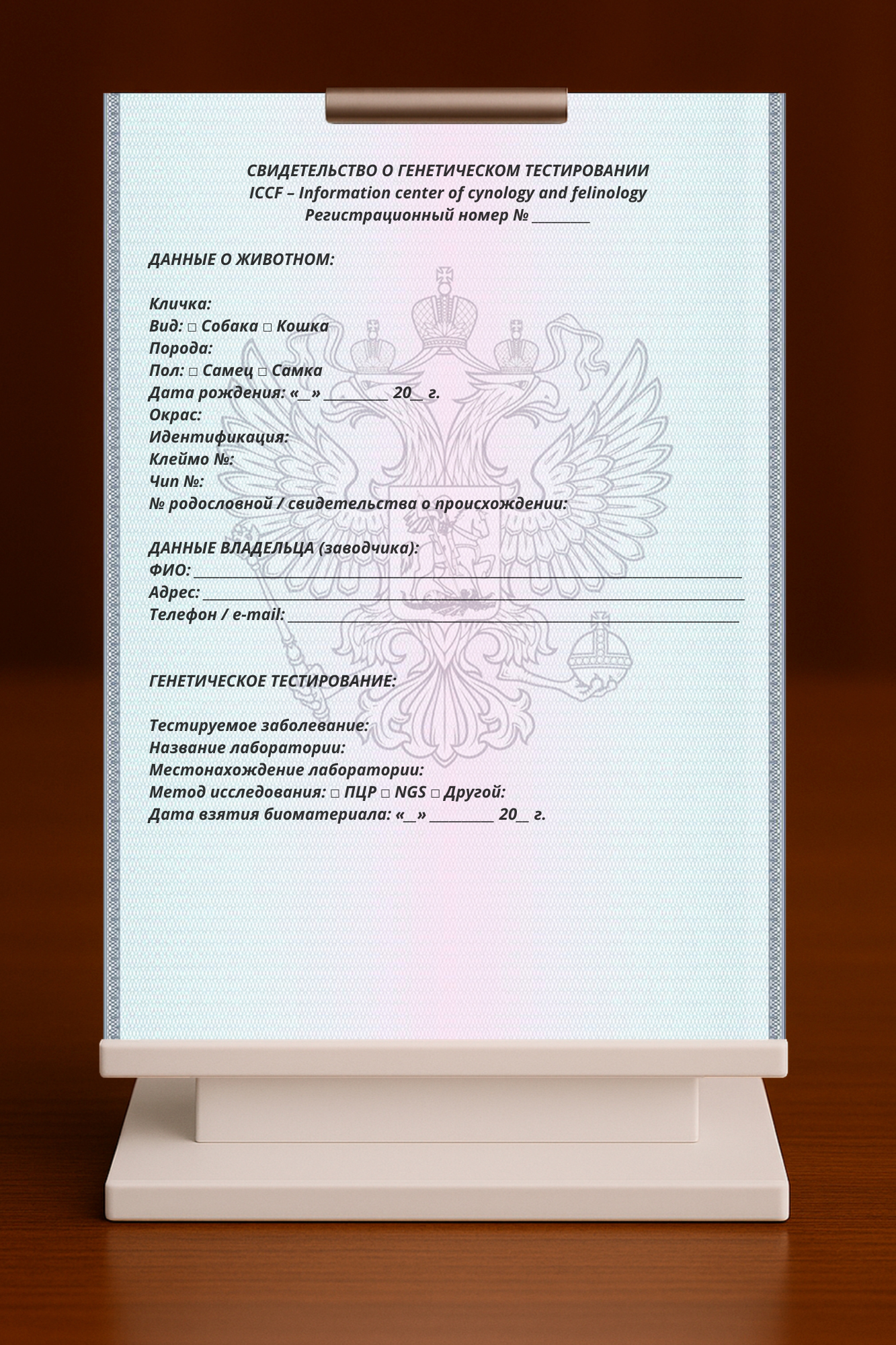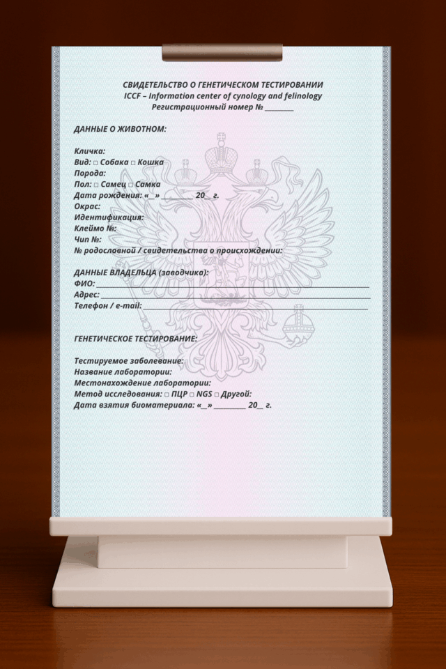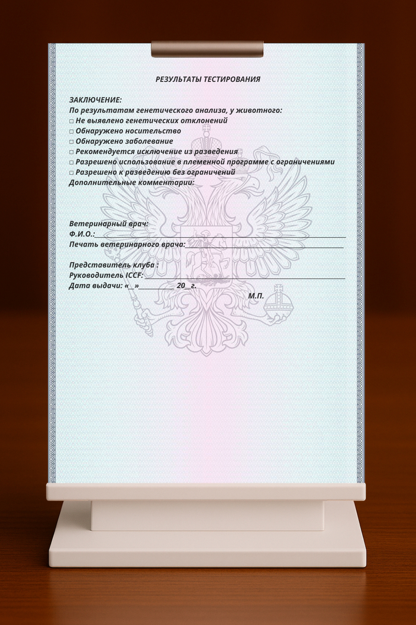 Свидетельство о результатах генетического тестирования — официальный документ, подтверждающий проведение и результаты генетического анализа животного. В документе указываются идентификационные данные питомца, лаборатория-исполнитель, перечень исследованных показателей и полученные результаты. Свидетельство подтверждает происхождение, отсутствие наследственных заболеваний и генетическую совместимость, служит основанием для допуска к разведению и регистрации в племенных книгах системы ICCF.